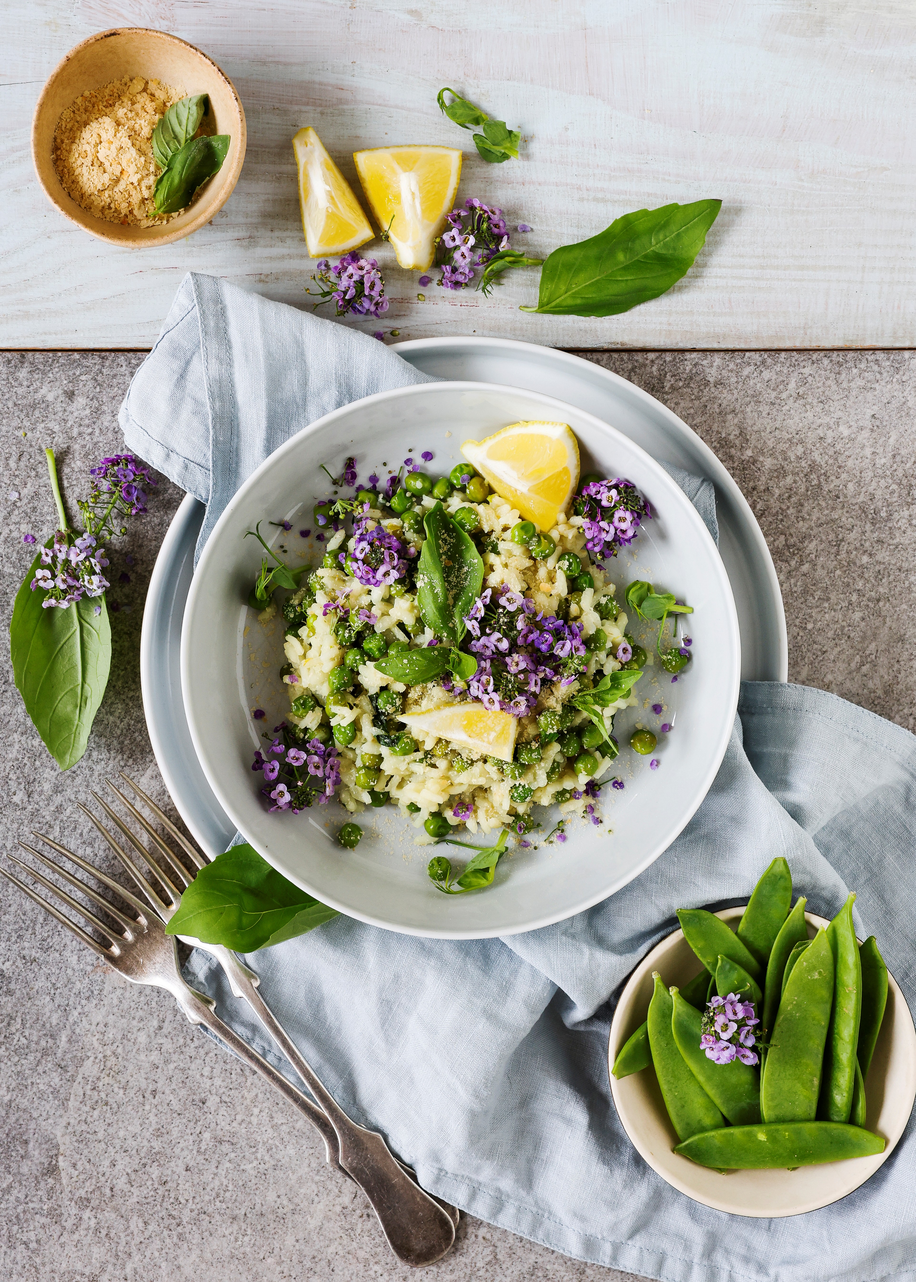 Na panvici rozohrejeme olivový olej a pridáme nadrobno nakrájaný cesnak. Krátko ho orestujeme, aby sa uvoľnila jeho vôňa. Pridáme ryžu Arborio a miešame, kým sa každé zrnko ryže obalí olejom. Postupne pridávame horúcu vodu/zeleninový vývar, vždy po naberačke, a miešame, kým sa voda/vývar nevstrebe. Tento proces opakujeme, kým ryža nezmäkne a rizoto nezíska krémovú konzistenciu. Ku koncu pridáme mrazený hrášok, citrónovú šťavu, citrónovú kôru a dochutíme soľou a čiernym korením. Pred podávaním vmiešame nasekanú čerstvú bazalku a rizoto podávame teplé.